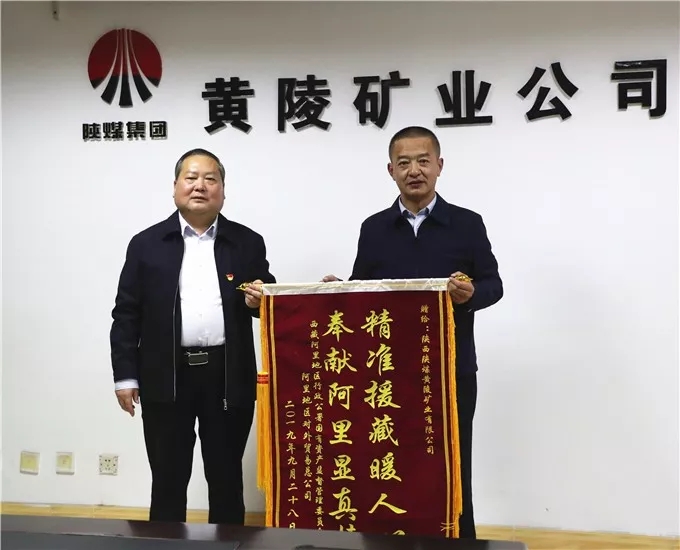 “精準援藏暖人心 奉獻阿里顯真情”。10月10日下午,公司援藏幫扶單位——西藏阿里對外貿(mào)易總公司總經(jīng)理李新川代表阿里地區(qū)國有資產(chǎn)監(jiān)督管理委員會向黃陵礦業(yè)公司送來錦旗。