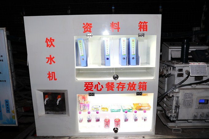 “愛心小超市”門口左側(cè)安裝了防爆飲水機(jī),可隨時(shí)為職工提供免費(fèi)開水,在防爆水箱的上面安裝了防爆電熱爐,可以加熱職工自帶的班中餐或礦上送的午餐。同時(shí),在防爆飲水機(jī)右側(cè)的貨架上,還放置了紅茶、純凈水、火腿腸、方便面、餅干等飲料和食品,并配備了常用藥、酒精、紗棉等井下急救用品的急救藥箱。