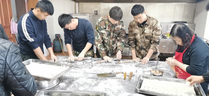 餐廳里大家,擼起袖子、摩拳擦掌,仿佛面對(duì)獵物一般,大展身手、齊心協(xié)力很快就擺滿了一個(gè)個(gè)盤(pán)子。窗外雖寒意襲人,但屋內(nèi)熱鬧非凡、歡聲不斷。一疊疊形狀各異、獨(dú)具一別的餃子端上餐桌,配上熱氣騰騰的餃子湯,讓同志們忘卻了冬日的寒冷,感受到的盡是暖暖的溫暖。