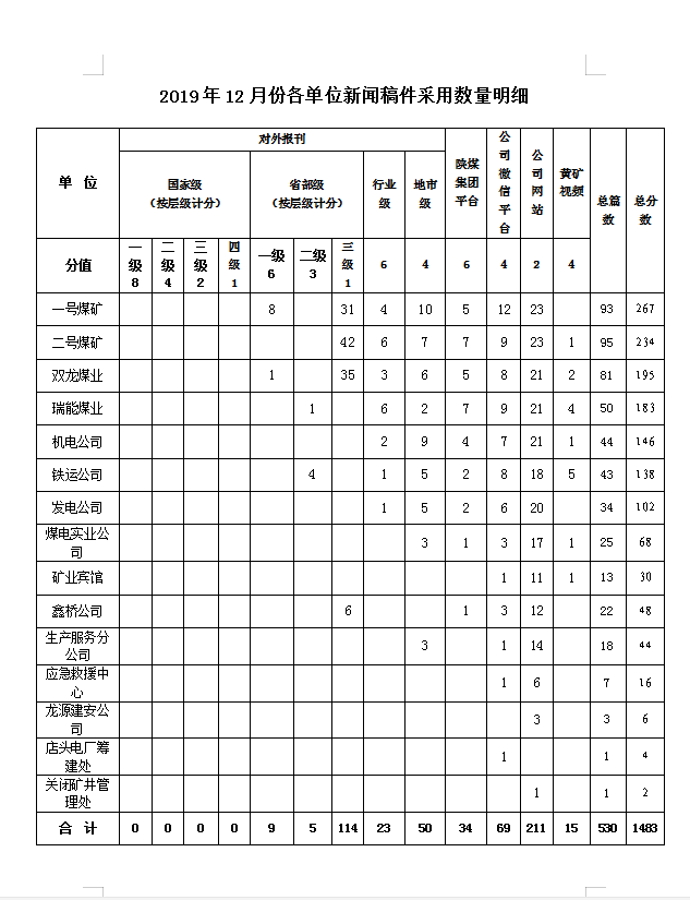 2019年12月份各單位新聞稿件采用數(shù)量明細(xì)
