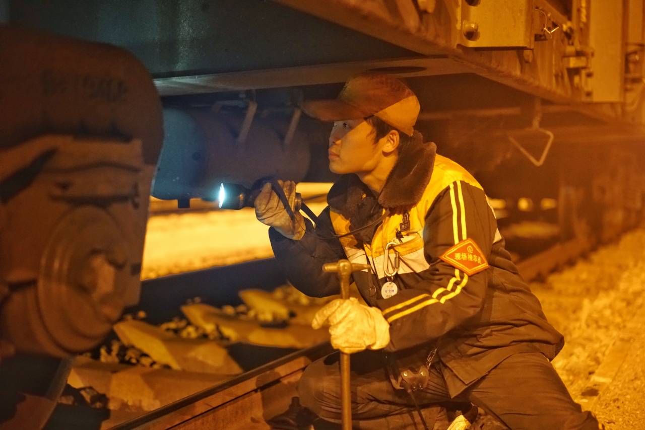 20分鐘后,楊清帶領(lǐng)8名檢車員直奔作業(yè)現(xiàn)場。在設(shè)置好防護信號后,檢車員孟凱拿起手電筒、檢車錘等工具,和工友們一起貓著身子,鉆進了列車底部不足30平方米的昏暗空間里,時而彎腰弓背,時而抬頭側(cè)瞄。順著電筒光的反射,縱橫交錯的管線、密布的螺栓,都在孟凱如炬的“鷹眼”里一一掃描。天氣雖冷,但大家干勁兒不減,看部位、敲配件,嚴格執(zhí)行著作業(yè)標準。那些忙碌的身影精神飽滿地奔走在一列列整裝待發(fā)的列車旁,他們敲下的每一錘都是對安全最好的承諾。
