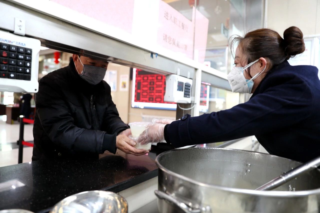 “元宵節(jié),是一個(gè)充滿‘家’的味道的傳統(tǒng)節(jié)日,我們已經(jīng)連續(xù)10年開展元宵節(jié)送湯圓活動(dòng)了,每年都要舉辦猜燈謎、拔河比賽等活動(dòng),但今年比較特別,為了避免人員聚集,我們把猜燈謎、拔河比賽活動(dòng)取消了,但元宵節(jié)吃湯圓不能取,今天特意在三餐期間用一次性飯盒提供湯圓,不因疫情管控而失去傳統(tǒng)節(jié)日的溫情?!闭诿χ虬鼫珗A的餐廳主管廉艷玲說道。