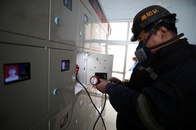 入井前,雙龍煤業(yè)綜采隊(duì)職工王江和同事陳朝清正在從智能礦燈充電柜里面取出各自的礦燈和自救器。