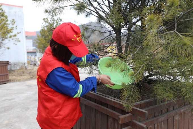 “這些樹苗剛剛移栽過來,要多呵護,才能茁壯成長”。礦區(qū)東側的污水處理站院內,志愿者劉小麗正在為移栽來的雪松澆水。