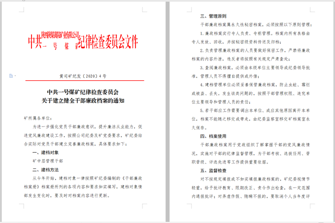 “這個(gè)檔案里面保存了《黨員干部基本情況登記表》《拒絕違規(guī)收送禮金承諾書》《黨員干部重大事項(xiàng)報(bào)告表》《廉政鑒定表》等內(nèi)容,黨員干部個(gè)人廉政信息一目了然。”該礦廉政檔案保管員打開《一號(hào)煤礦黨員干部廉政檔案》袋介紹到。該礦紀(jì)委下發(fā)了《關(guān)于建立健全干部廉政檔案的通知》,完善了《黨員干部廉政檔案管理辦法》,進(jìn)一步深化廉政檔案管理,為全礦80名中層管理干部建立了個(gè)人廉政檔案,按照先掌握基本情況后逐步完善的原則,全面收集個(gè)人基本情況、廉政承諾、廉政鑒定、黨紀(jì)政務(wù)處分等內(nèi)容,同時(shí),綜合上級(jí)紀(jì)委專項(xiàng)監(jiān)督檢查、重大節(jié)日期間黨風(fēng)廉政檢查、反“四風(fēng)”體檢查廉等方面的信息,多渠道掌握干部廉潔從業(yè)情況,推動(dòng)廉政檔案工作有形覆蓋、有效延伸,切實(shí)把廉政檔案建起來(lái)。
