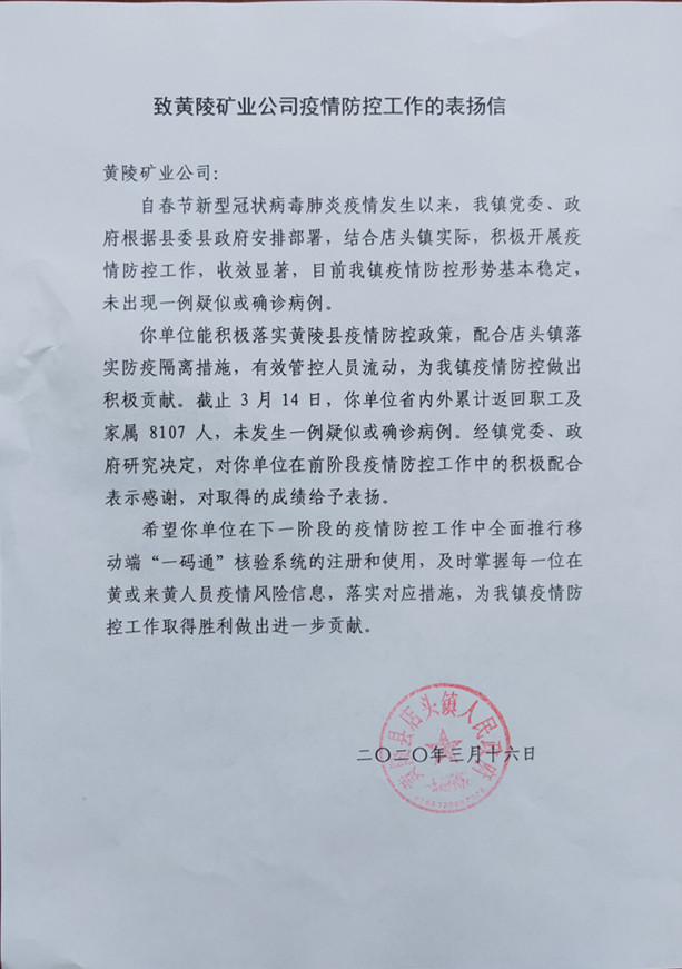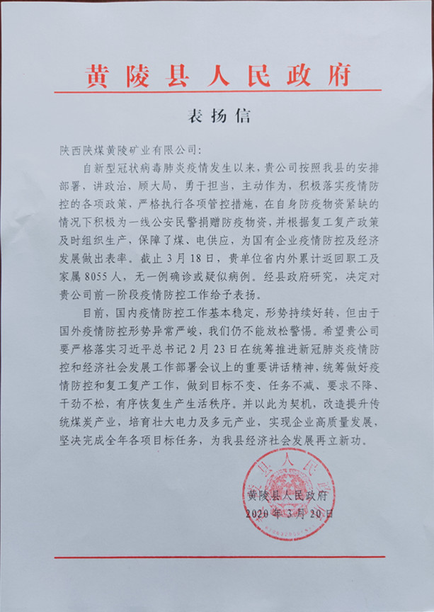近日,公司收到黃陵縣人民政府和和店頭鎮(zhèn)人民政府發(fā)來(lái)的表?yè)P(yáng)信。信中對(duì)黃陵礦業(yè)公司在前一階段的疫情防控工作表示衷心感謝,并提出表?yè)P(yáng)。