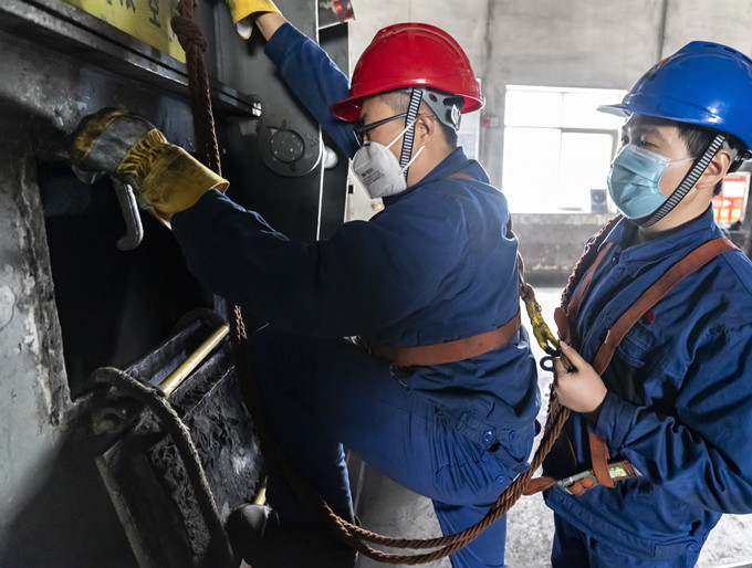 要對煤倉襯板進行檢查,徹底清理煤倉內(nèi)的積煤是前提,也是此次煤倉襯板檢查工作的“重頭戲”。在按照NOSA安健環(huán)檢修工作標準流程辦理熱力機械工作票、填寫危險點分析與預控安全措施票、執(zhí)行并確認各項安全防護措施后,清倉作業(yè)正式拉開帷幕。只見一組人員將抗拉強度和抗沖擊強度符合國家標準要求的安全繩固定在結實可靠的構架上,纏繞不少于2圈,同時與構架棱角接觸處加好襯墊。