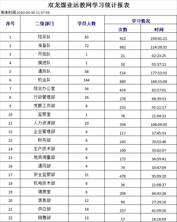 “綜采隊(duì),學(xué)習(xí)人數(shù)83人,學(xué)習(xí)次數(shù)922次,累計(jì)時(shí)間:230:41:21。”在該礦學(xué)習(xí)群里清楚顯示著3月份各部門區(qū)隊(duì)參與《中國(guó)煤炭教育網(wǎng)》的學(xué)習(xí)情況。