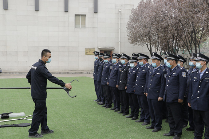 隨后,在辦公樓操場上就鋼叉、盾牌、抓捕器等專用反恐防暴器材的使用方法、注意事項及攻防技能進行了全面的培訓。