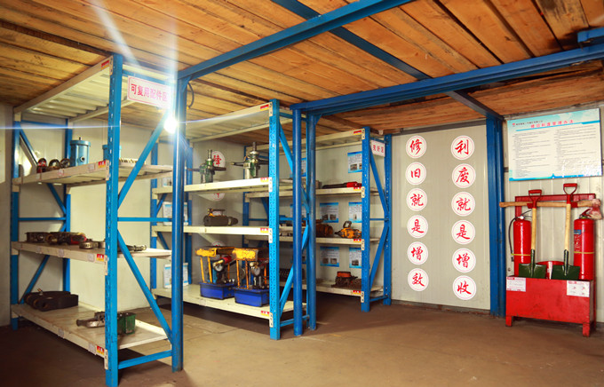走進(jìn)二號煤礦掘進(jìn)一隊庫房,面積不大的庫房,整齊的被分割成正在維修損壞設(shè)備及配件的作業(yè)區(qū)、堆放損壞設(shè)備的待修以及完好設(shè)備配件發(fā)放區(qū)。庫房內(nèi),諸如修好的錨桿機、風(fēng)鎬、張緊泵、邁步支架閥組、二連按鈕、釬桿連接套等,用舊工字鋼、舊管路、舊鋼管制作各種物料架、行人過橋,用鋼材邊腳料加工各種錘頭,舊皮帶加工的電纜加固鉤防護(hù)裝置、廢舊鋼筋網(wǎng)片加工的鉆場水溝蓋板等等,各類修舊利廢成果琳瑯滿目。