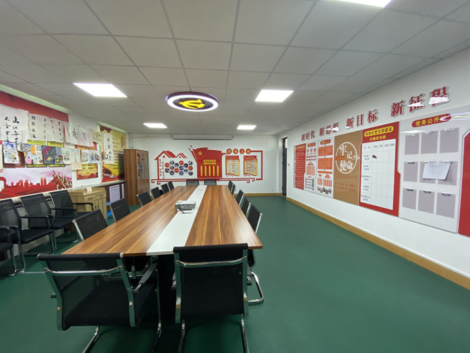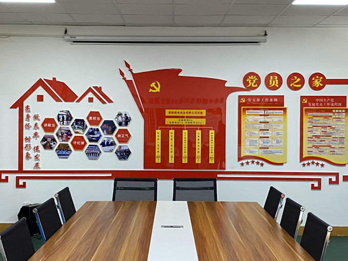 由社會主義核心價值觀和黨的發(fā)展歷程指引著我們從三樓臺階而上步入四樓活動室,簡潔大氣的布局、紅黃相映的色調(diào),給人一種莊嚴肅穆的感覺,不由令人精神振奮、熱血澎湃。室內(nèi)天花板上鑲嵌著鮮紅的黨旗燈飾,墻壁上以黨旗、入黨誓詞為中心,依次布設的黨員義務權(quán)利、黨的紀律、組織機構(gòu)等板塊,還掛有詳細的黨委會議事,干部選拔和入黨流程圖,時刻提醒黨員干部要將黨的制度準則銘記于心并深刻領(lǐng)會。黨務公開欄和黨建活動風采墻展現(xiàn)出分公司豐富多彩的黨建活動和積極向上的員工風采。除此之外,還配備了電腦、攝像機、投影儀等教學設備,購置了桌椅、辦公設施及書籍、報刊等,標準化的軟硬件設施充分保障了教育培訓需求,為黨員提供一個良好的活動陣地和學習環(huán)境。