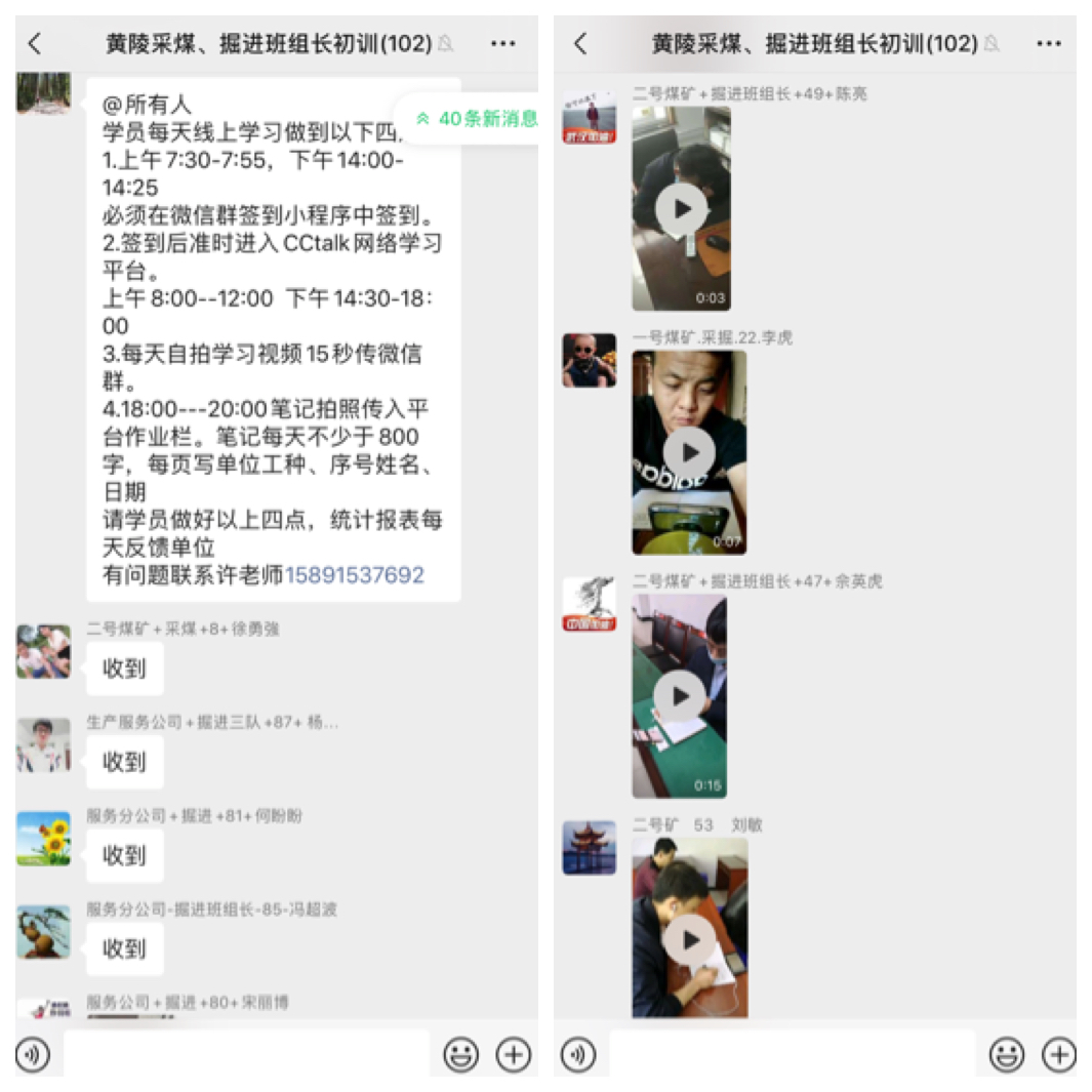 “請學員簽到后準時進入CCtalk網(wǎng)絡(luò)學習平臺,每天將學習視頻及筆記上傳微信群,作業(yè)上傳平臺作業(yè)欄。”5月12日,公司煤礦班組長素質(zhì)提升初訓班正式線上開班,班主任在微信群中做以上要求。