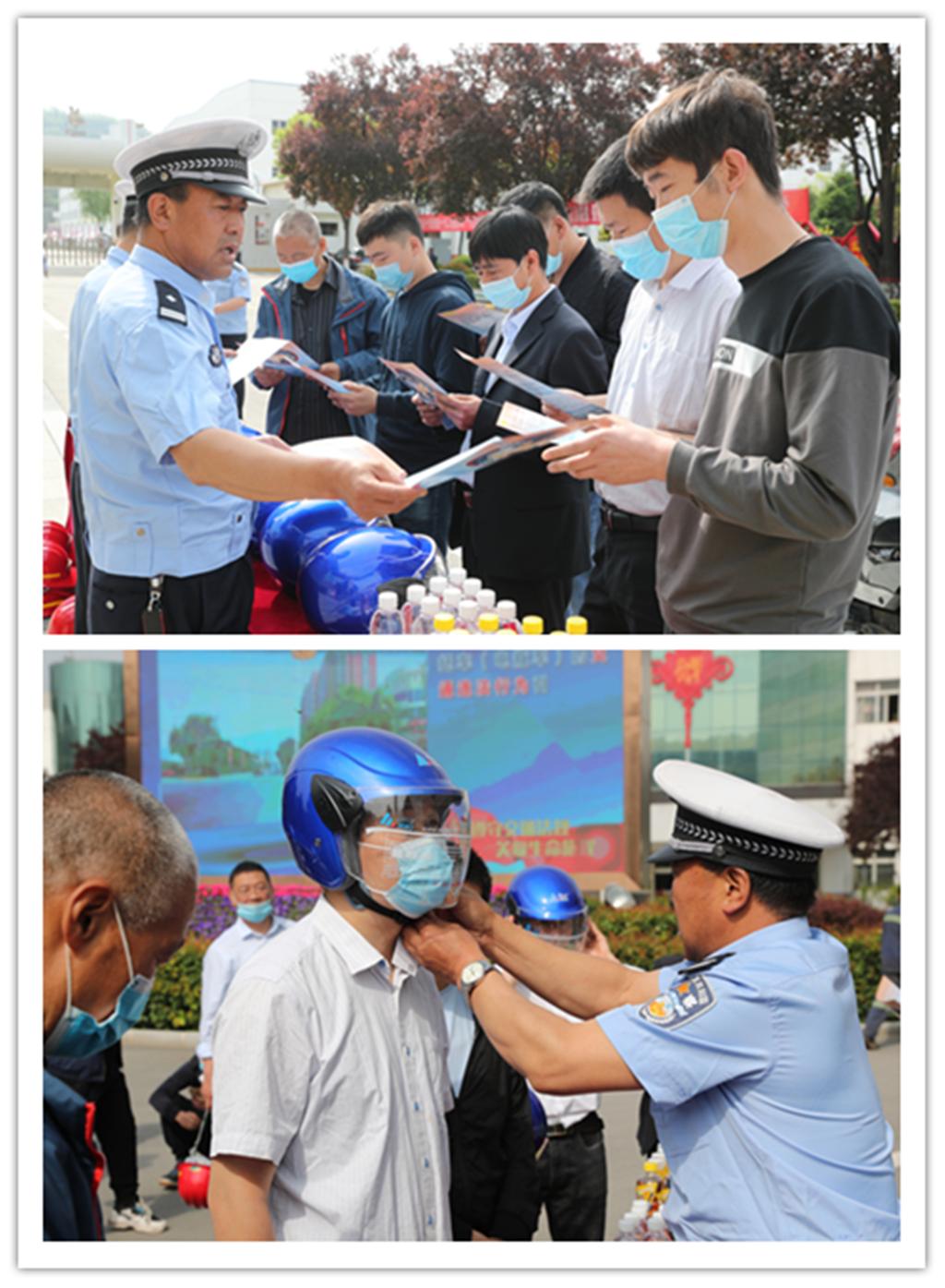 為全力保障復工復產(chǎn)后道路交通安全暢通,增強廣大職工駕乘使用安全帶、騎乘佩戴安全帽的安全意識,預防和減少交通安全事故。5月20日,黃陵公安交警店頭中隊與黃陵礦業(yè)一號煤礦攜手在礦區(qū)開展了“一盔一帶”宣傳教育活動。