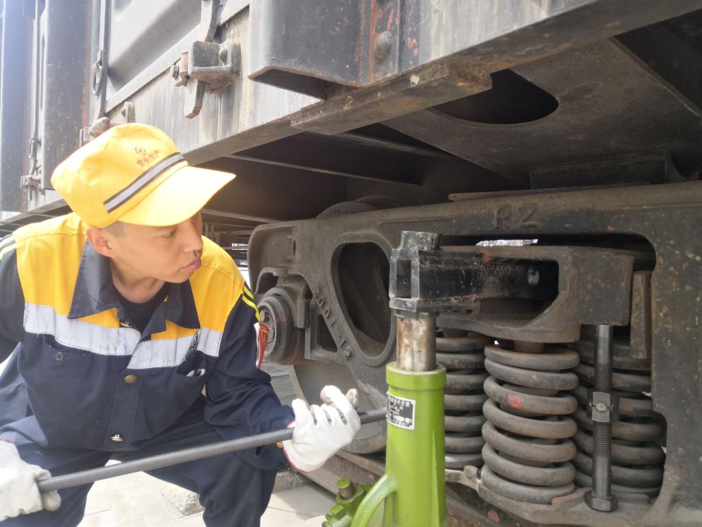 在得到路方人員同意后,他立即帶領(lǐng)兩名檢車員攜帶著專用工具,前往作業(yè)現(xiàn)場(chǎng),在枕簧更換現(xiàn)場(chǎng),王瑞鵬架起他自制的更換工具,三人配合干凈利索完成了折斷枕簧的更換,使得這輛車可以免于回送。