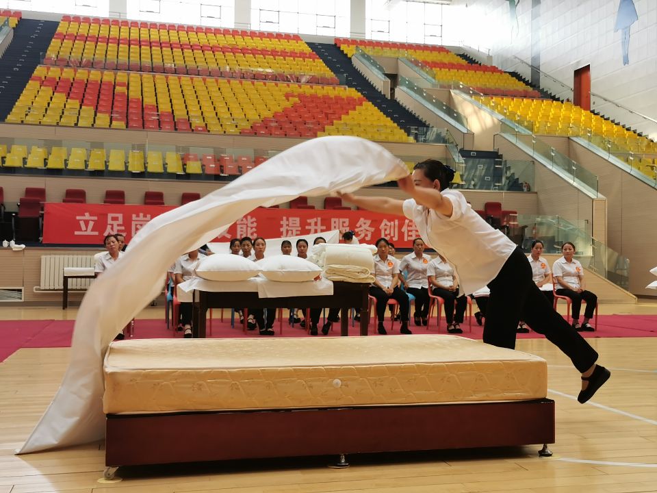 據(jù)了解,參加此次比武的16名選手均經(jīng)過前期理論+實(shí)操預(yù)賽,脫穎而出進(jìn)入決賽。此次決賽分為中式鋪床和現(xiàn)場問答兩個環(huán)節(jié),其中中式鋪床要求參賽選手在3分鐘之內(nèi),按標(biāo)準(zhǔn)完成拋單定位、90度包角、套被子和枕頭等步驟。評委分別從選手操作規(guī)范、完成時間、儀容儀表,現(xiàn)場問答等方面進(jìn)行公平公正的打分,最終將結(jié)合理論成績評選出一、二、三等獎。