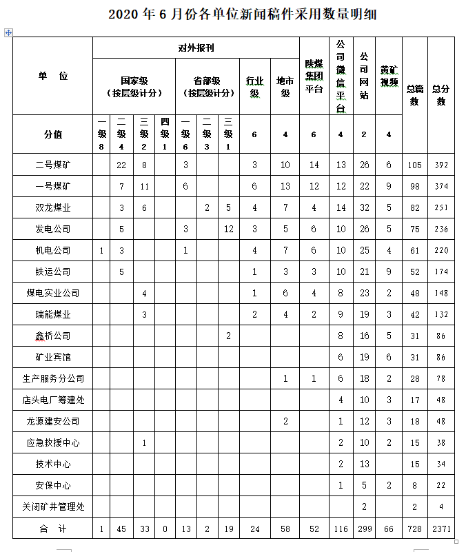 2020年6月份各單位新聞稿件采用數(shù)量明細(xì)