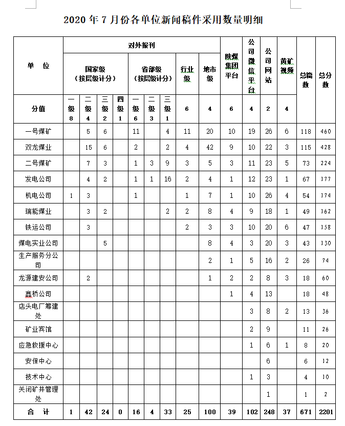 2020年7月份各單位新聞稿件采用數(shù)量明細