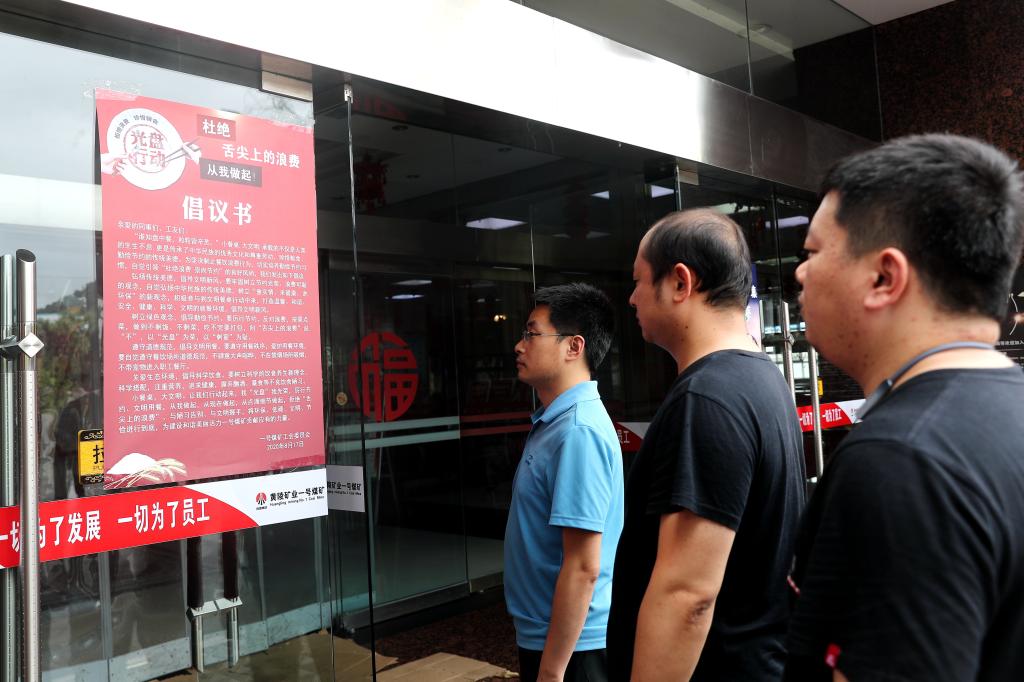 “一粥一飯,當(dāng)思來處不易;半絲半縷,恒念物力維艱”“一粒米千滴汗、粒粒糧食汗珠換”“不剩菜、不剩飯”“文明用餐、節(jié)儉惜?!薄?月16日,筆者走進(jìn)一號煤礦職工餐廳,在餐館醒目的位置均懸掛有宣傳標(biāo)語,餐桌上擺放著“文明用餐”提示語,處處可見倡導(dǎo)節(jié)儉、拒絕“剩宴”的溫馨提醒,營造出浪費可恥、節(jié)約為榮的良好氛圍。