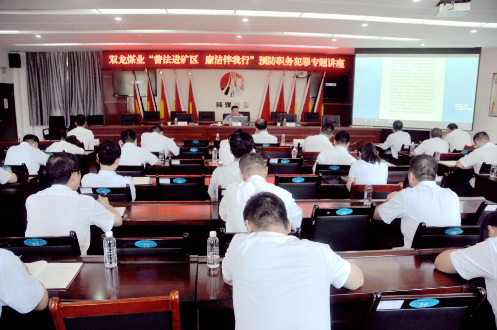 8月21日下午,在雙龍煤業(yè)四樓會(huì)議室,一場(chǎng)別開(kāi)生面,“廉”味十足的普法專題會(huì)正在進(jìn)行。該礦邀請(qǐng)到黃陵縣人民檢察院黃陵縣人民檢察院黨組書(shū)記、檢察長(zhǎng)師成明一行深入雙龍煤業(yè),舉辦主題“普法進(jìn)礦區(qū)廉潔伴我行”預(yù)防職務(wù)犯罪專題講座,該礦副科級(jí)以上管理干部50余人參加講座活動(dòng)。