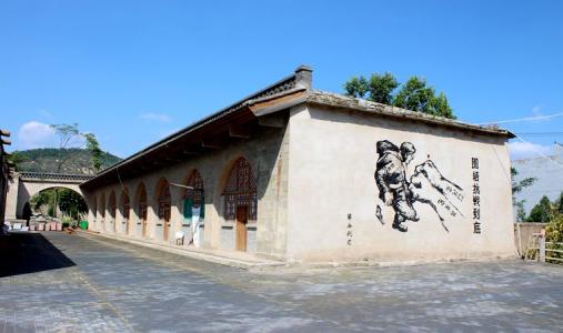 河岸北的臺地上,兩排總共約40多孔的石窯整齊的排列開,信步進了院子拾階而上,眼前一堵高墻上,一副簡約但卻意義深遠的宣傳畫卻把思緒帶到那個炮火紛紛的年代。