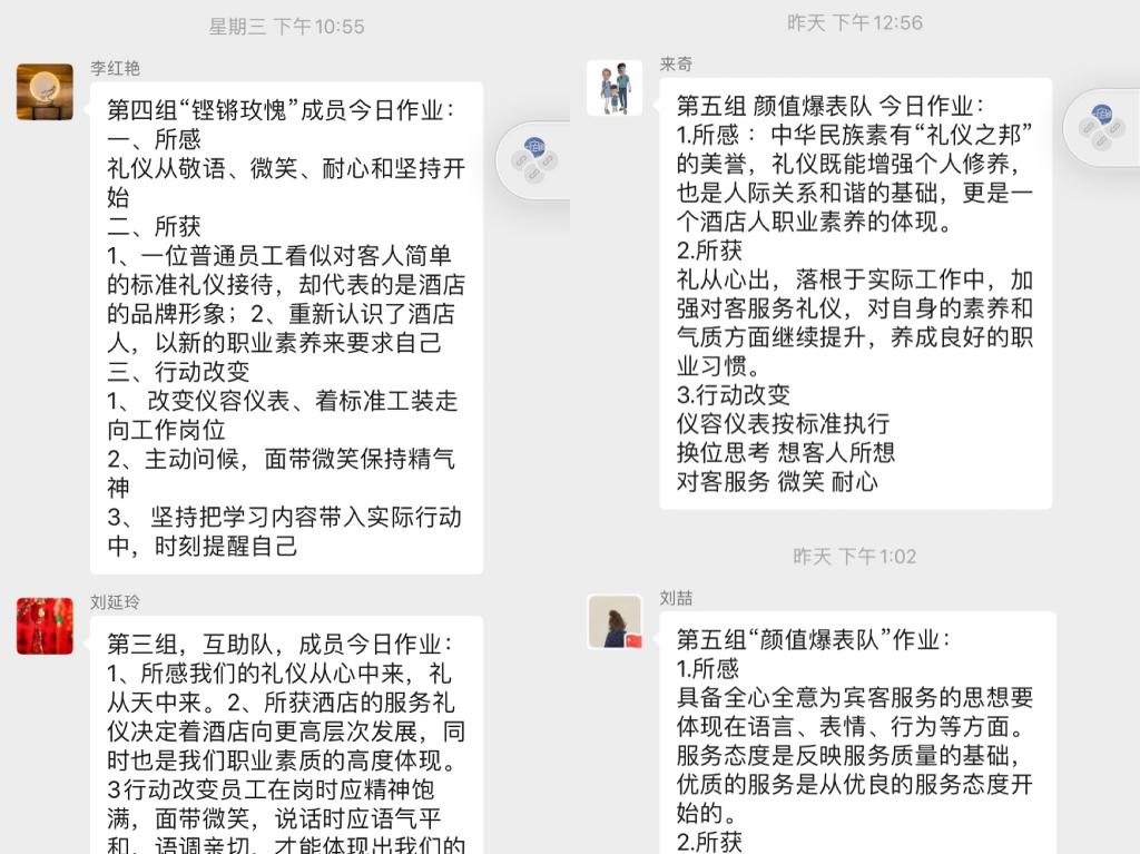 “第一組乘風(fēng)破浪組成員‘二個(gè)獲得’:酒店服務(wù)禮儀是一個(gè)酒店的品牌形象,也是酒店人的職業(yè)素養(yǎng)和個(gè)人修養(yǎng)。整潔大方的儀容儀表可以改變一個(gè)人做事的方式方法。”