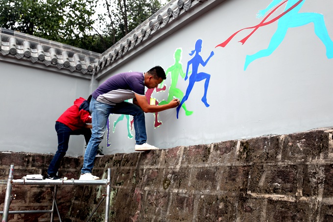 在墻體上進(jìn)行繪畫寫字,完全不同于在紙張上創(chuàng)作,為了克服困難,劉洋等人提前在紙上設(shè)計(jì)好內(nèi)容,頂著烈日在長達(dá)300多米,高低不一的墻體上按照內(nèi)容進(jìn)行劃分后標(biāo)準(zhǔn)好虛線,然后再進(jìn)行構(gòu)圖、顏色填充等,因墻體高低不一,最低處需要坐在地上進(jìn)行工作,高處則需要架起腳手架才能夠完成,一個(gè)多月下來,三人個(gè)個(gè)被曬黑了一層,但看著墻體上繪制完成的作品,他們的心里卻暖洋洋的。