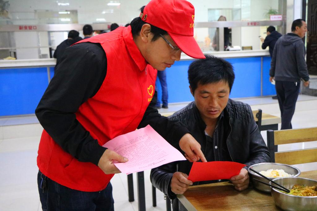 “師傅您好,現(xiàn)在從上到下都在講‘光盤’,就是要倡導(dǎo)大家發(fā)揚(yáng)我們中華民族的勤儉節(jié)約優(yōu)良傳統(tǒng),能吃多少就買多少,咱們堅(jiān)決不浪費(fèi)一粒糧食?!鼻嗄曛驹刚咝》株?duì)正在向就餐職工進(jìn)行著“光盤行動(dòng)”的宣傳引導(dǎo)。