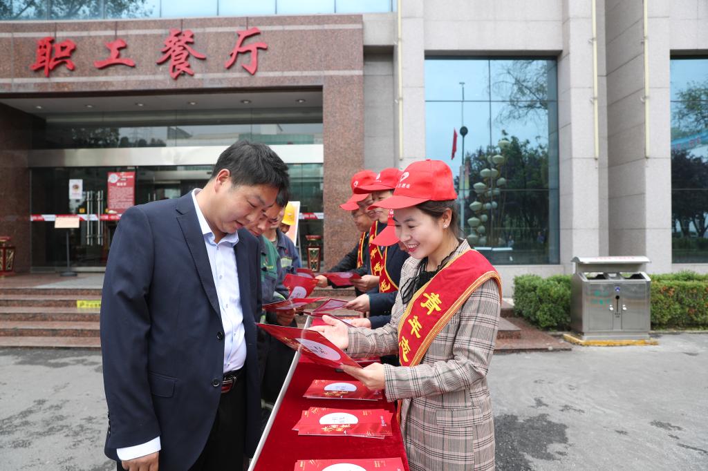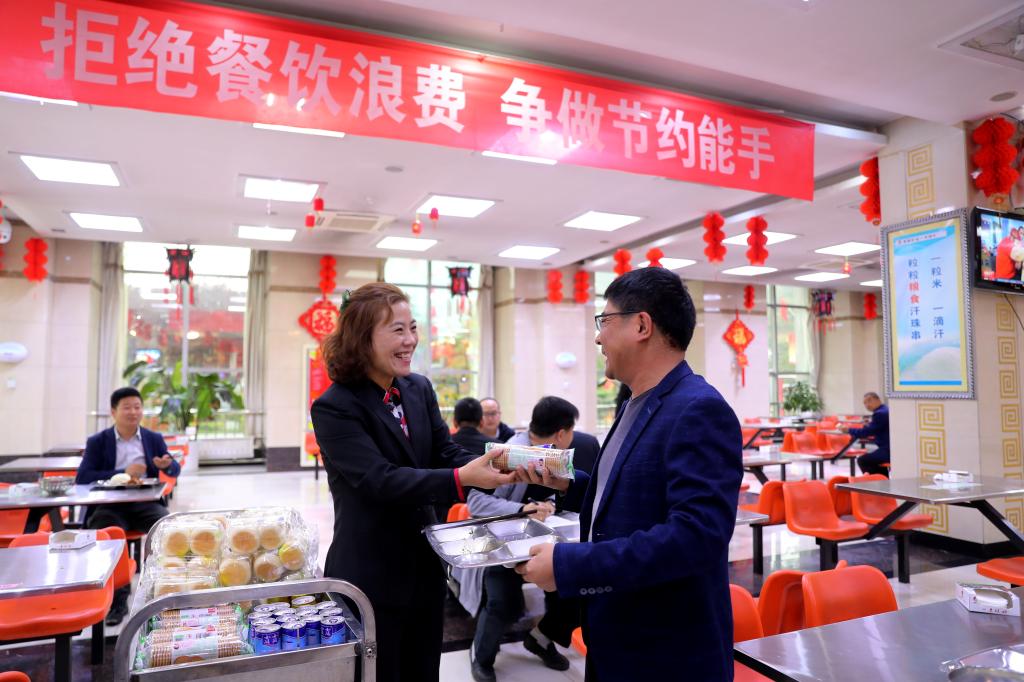 10月1日,職工餐廳管理員候萍推著小車,載滿了琳瑯滿目的禮物,在餐桌間的過道里來回穿梭,目光掃視著職工們的餐盤,向“光盤”的職工們發(fā)放禮物。