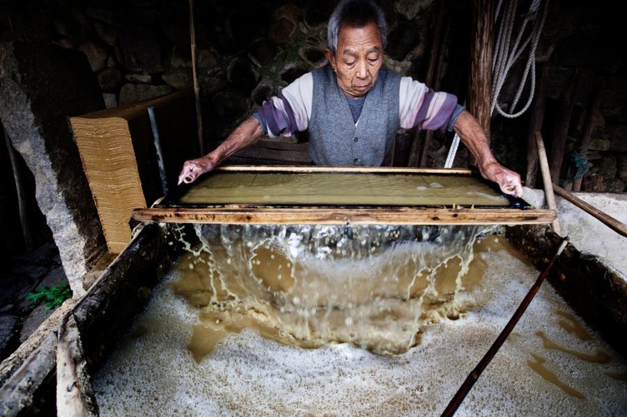 陰干后的紙料再次入鍋蒸后進(jìn)行漂洗、晾干,撿去里面的雜質(zhì)后捆成捆,固定到一個專用的木凳子上,用大刀片切碎后用布包包好,再過一遍清水后方可以進(jìn)入紙池,在紙池里與水混合在一起形成紙漿后進(jìn)行撈紙。