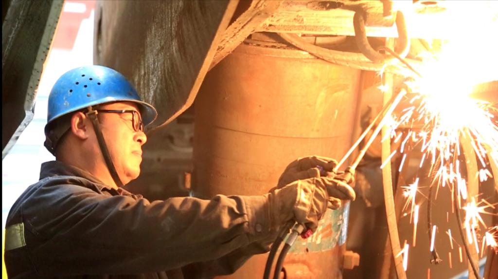 上午10點(diǎn)多,天氣開始變暖和。肖寧微胖的身體在支架內(nèi)鉆出鉆進(jìn),一會(huì)拿起割槍一會(huì)拉過焊把,焊花照亮了他兩鬢的汗珠。