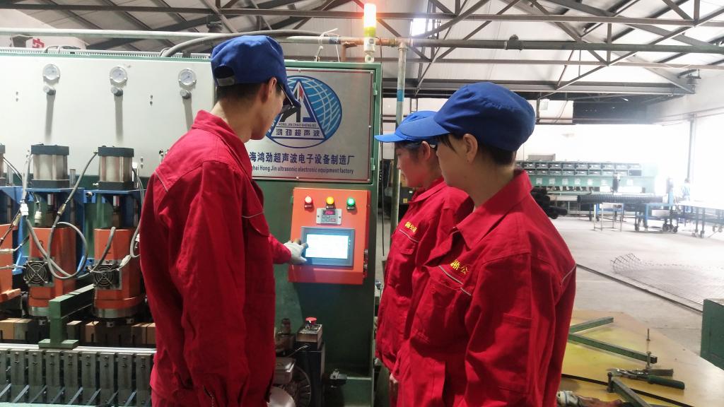“咱們主要負責焊接編織機啟動、關(guān)閉工作,但不是簡單的按開關(guān)鍵就結(jié)束了。要在機器運轉(zhuǎn)時觀察產(chǎn)成品的平整度,查看是否存在鼓包、漏織現(xiàn)象;焊接頭是否完好,焊接的成品是否牢固;隨時觀察線盤剩余量,將要空盤時第一時間關(guān)閉設備,打開空開進行接續(xù)工作?!睆秃暇W(wǎng)廠班長劉森正在進行崗前培訓。