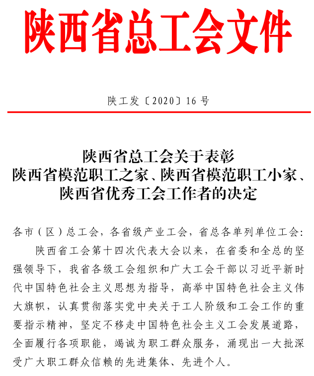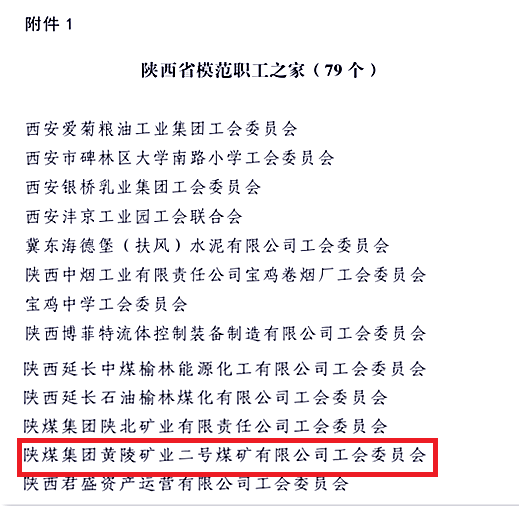近日,陜西省總工會下發(fā)了《關(guān)于表彰陜西省模范職工之家、陜西省模范職工小家、陜西省優(yōu)秀工會工作者的決定》,表彰命名了一批陜西省模范職工之家、模范職工小家等先進集體以及陜西省優(yōu)秀工會工作者。黃陵礦業(yè)二號煤礦工會被授予“陜西省模范職工之家”榮譽稱號。