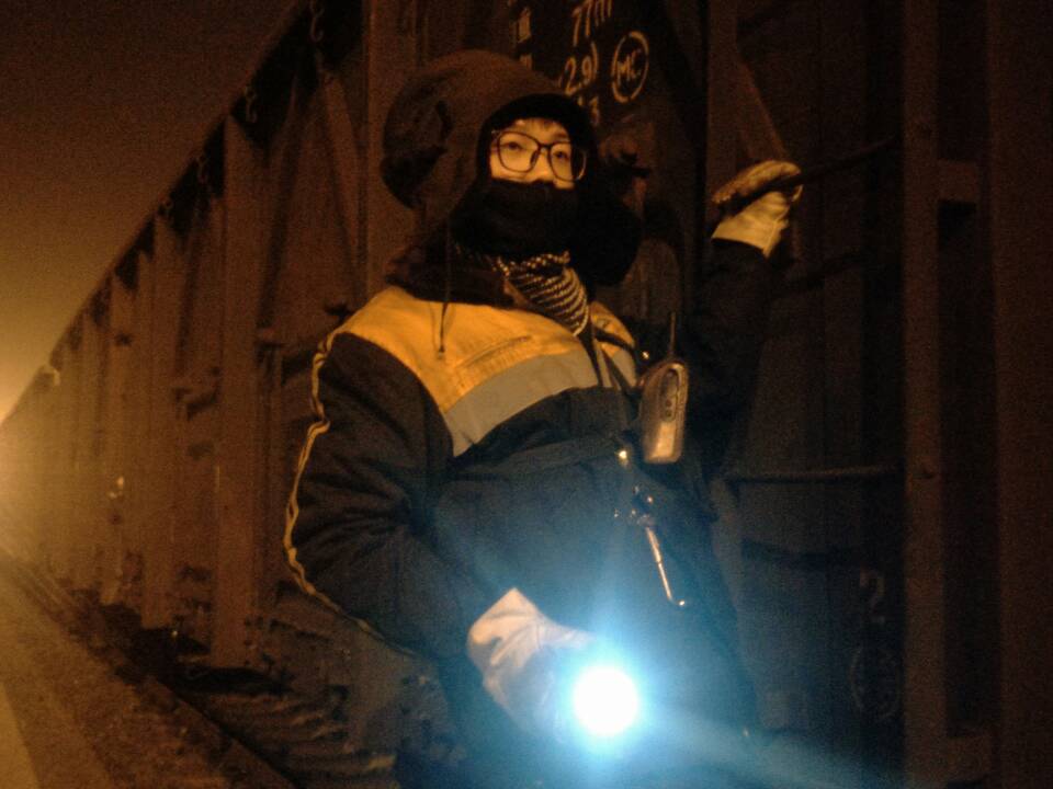 一會兒工夫,調(diào)車組的小伙子們個個臉頰都凍成了“高原紅”,呼出的氣都在睫毛上凝結(jié)成了冰霜?!靶●摇笔前嘟M中的“調(diào)二”,作業(yè)中需要扒車—“掛在”猶如大冰柜般的列車車梯上,盡管雙眼被寒風刺的直流眼淚,依然目不轉(zhuǎn)睛的緊盯前方線路與信號情況,確保安全作業(yè)萬無一失?!?932095”小褚認真地核對著車號,摘開制動軟管、實施好防溜措施、提開鉤銷,他的身影跟隨著作業(yè)車輛在濃濃地夜色中漸漸模糊了。