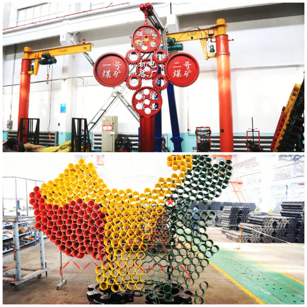 機(jī)修車間的作品則最具有中國元素,《中國結(jié)》與《中國地圖》的雕塑上到處都是熟悉的身影,報(bào)廢齒輪、螺母、生產(chǎn)托輥的下腳料等都是在機(jī)電總廠隨處可見的材料。
