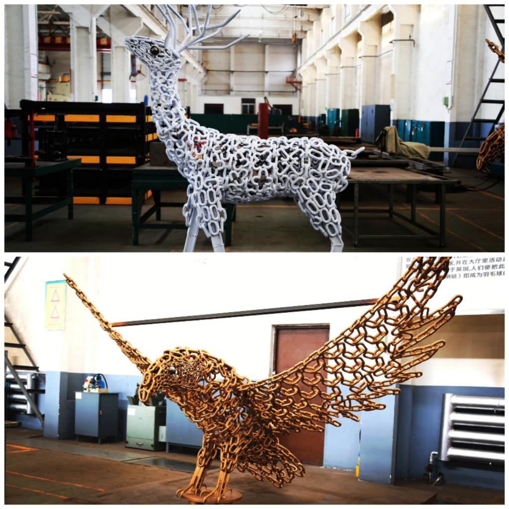 走進(jìn)該廠綜合車間,便可見到一只栩栩如生的白鹿與一只正欲展翅高飛的雄鷹。報(bào)廢的吊鏈在該車間職工冉崇軍與李峰的手里通過設(shè)計(jì)、分解、焊接,搖身一變,成了兩座美輪美奐的動(dòng)物雕塑。