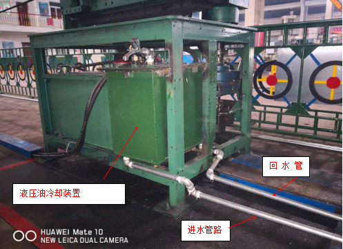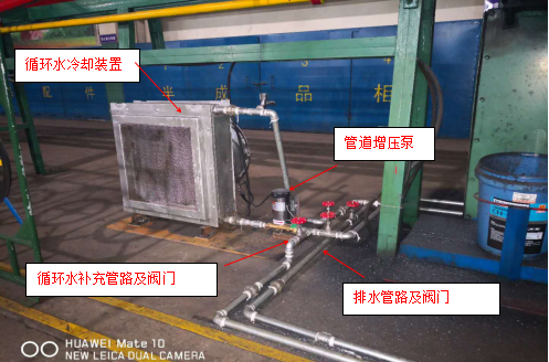 為了解決這一問題,該車間通過將液壓油散熱片放在密閉的循環(huán)水箱內(nèi),實(shí)現(xiàn)冷卻水全方位帶走散熱片熱量,通過外置散熱裝置配備0.85KW軸流風(fēng)扇,實(shí)現(xiàn)循環(huán)水機(jī)械散熱,0.3KW管道泵實(shí)現(xiàn)冷卻水系統(tǒng)循環(huán)。整套裝置用水一次性注入后可循環(huán)使用,月新增用水量僅1公斤,遇到檢修時(shí)通過圖二中的排水閥門將水排放,檢修完成通過圖一循環(huán)水補(bǔ)充閥門進(jìn)行補(bǔ)水。