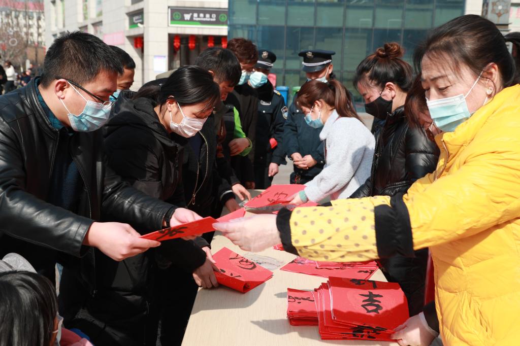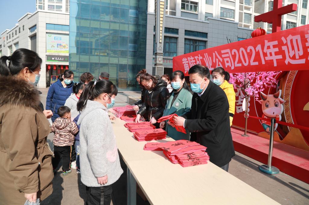 “請大家戴上口罩、排好隊,每個人都有?!薄澳髮β?lián),還是小對聯(lián)?”中心區(qū)大石頭處一派喜氣洋洋,為每名職工及家屬發(fā)放對聯(lián)和“福”字,職工們臉上洋溢著幸福的笑容。