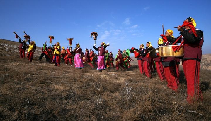 隊伍上了塬畔,轉(zhuǎn)過溝彎,翻過崾峴,一個村莊接著一個村莊,人們早就站在村口焦急的等待,還沉浸年味中的孩子們端著碗筷,擠在人群中,恨不得能夠在一夜之間能夠長到和大人們一樣高,更有些年紀稍大的少年,早就爬上麥秸垛,或是騎在村口打谷場的樹杈上等著二軍爺隊伍的到來。