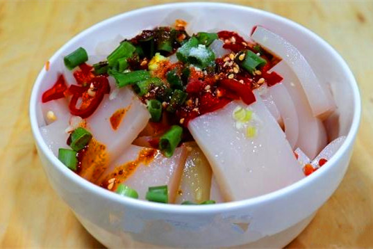 蕎麥涼粉口味醇香,做工卻繁雜費(fèi)時,做傳統(tǒng)蕎麥涼粉,一般有幾個工序必不可少。奶奶每次做涼粉時,先把蕎麥用碾子脫皮篩掉細(xì)面留下糝子,再取一定數(shù)量的酥糝放入盆中,加入適量清水泡軟,然后倒在案板上反復(fù)搓揉成面泥,這是關(guān)乎涼粉是否筋道的技術(shù)活。等糝子揉搓到?jīng)]有顆粒的時候,就把搓好的面泥泡在水盆里,一遍遍揉洗,過濾,反復(fù)洗到只剩渣子。將面水靜置沉淀,等沉淀好了,倒掉多余水分?jǐn)嚦擅婧?,將面糊倒入鍋?nèi),小火加熱,用搟面杖順著同一方向不斷攪圈,直到白白的面糊慢慢變得晶瑩剔透,用搟面杖挑起能掛住不掉,這涼粉算是做成了。這個過程中,火候是做好涼粉的關(guān)鍵,火候不好就做不出勁道漂亮的成品,這是很是考驗廚藝和智慧的環(huán)節(jié)。每次涼粉快做好的時候,我都是等不及的狀態(tài),而奶奶也會單獨(dú)舀出一小碗放入涼水桶里,讓其快速放涼,我就在一邊等著,等涼到可以整塊從碗里倒出來時,奶奶就把碗倒扣在案板上,一個光滑潔白的涼粉坨兒就等切來吃了。切之前,奶奶會用手拍一拍,試試涼粉是否柔軟筋道。蕎麥涼粉的吃法有很多種,酸湯、涼拌和熱炒都可以。我最喜歡吃奶奶的涼拌涼粉或漿水涼粉:涼粉切成細(xì)條兒、塊兒裝碗,用油鹽醬醋和蒜水、辣子油等拌成酸辣涼粉,或者加一炒勺用地椒花熗好的漿水調(diào)成漿水涼粉,放在小桌上,我便迫不及待的挑一筷頭入口,瞬間就滑進(jìn)了胃里,那叫一個過癮、也叫一個痛快??粗宜查g連吃帶喝光盤空碗,奶奶眼里就全是欣慰和滿足!