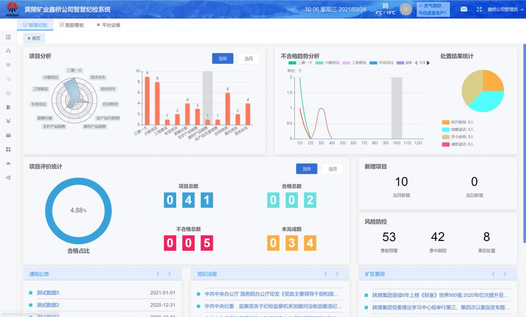 該平臺(tái)在構(gòu)建之初,進(jìn)行了廣泛的調(diào)研和討論,并邀請(qǐng)技術(shù)人員到兄弟單位進(jìn)行對(duì)標(biāo)學(xué)習(xí)與借鑒。在礦業(yè)公司“一總線,二保障,‘24534’體系”總體要求下,形成了具有鑫橋特色的“12345”智慧紀(jì)檢監(jiān)察系統(tǒng)。即以紀(jì)檢監(jiān)察業(yè)務(wù)數(shù)據(jù)為一條總線;網(wǎng)絡(luò)端與移動(dòng)端雙端同步關(guān)聯(lián)數(shù)據(jù);事前、事中、事后三方位預(yù)警提醒;短信、郵件、手機(jī)小程序、網(wǎng)絡(luò)站內(nèi)信四種提醒模式;通過信息抓取與信息發(fā)布功能,實(shí)現(xiàn)國家紀(jì)委、陜煤集團(tuán)、黃陵礦業(yè)、鑫橋公司及下屬基層單位的五級(jí)信息共享。