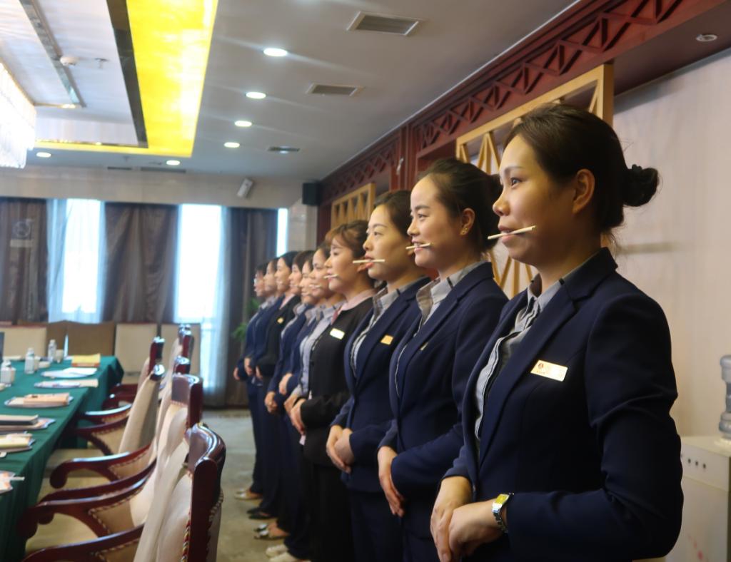 冰凍三尺非一日之寒。微笑練習已成為礦業(yè)賓館人每天的“必修課”。她們時刻牢記熱情、用心、用情的服務宗旨,苦練坐姿、站姿、走姿、手勢操、微笑等基本功?!罢垙膬?nèi)心發(fā)出真誠的笑容?!薄懊夹氖嬲?,面帶微笑,嘴角上揚?!痹诘V業(yè)賓館舉辦的服務禮儀培訓課上,服務員認真地學習服務儀容儀表、接待禮儀等內(nèi)容,通過情景模擬的方式把“微笑服務”融入日常規(guī)范中。
