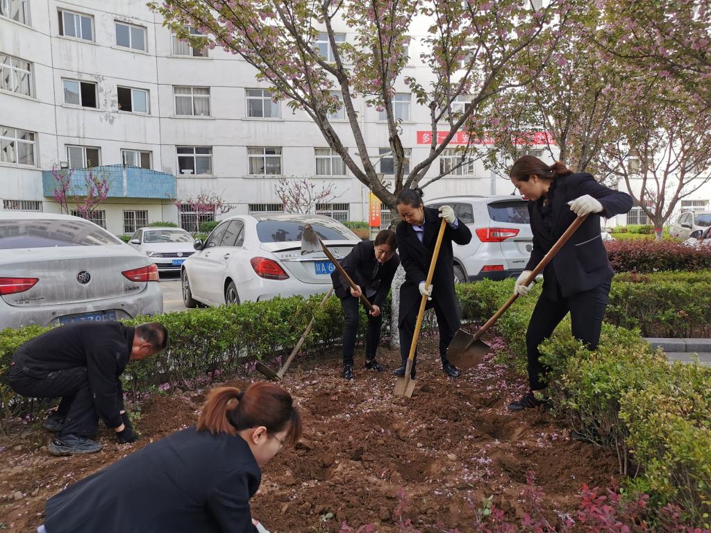 綠化不僅增了生機,也帶來一絲愜意。在公寓大院,服務(wù)人員正在栽植各類樹木和花卉,填土、壓實、澆水,分工合作,有序忙碌,為公寓大院增綠添色。