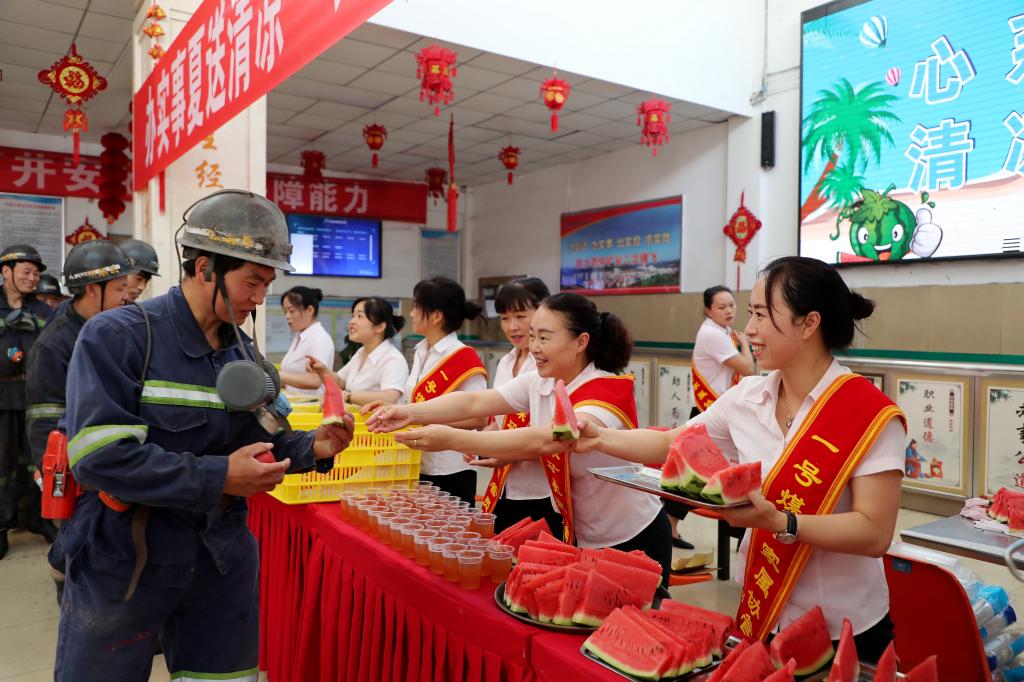 七月流火,炎炎夏日。隨著夏季“三伏”天氣的到來,持續(xù)高溫的“桑拿”天氣,給堅守在生產(chǎn)一線的廣大職工帶來了身心上的巨大“烤”驗。為緩解因天氣炎熱帶來的身體不適,為進一步做好一線職工防暑降溫工作,促進礦井安全生產(chǎn),7月9日,一號煤礦工會開展了以“辦實事夏送清涼?比擔當共筑安全”為主題的送清涼活動。該礦家屬協(xié)管員們?yōu)榈V工師傅送去了西瓜、黃瓜、西紅柿、綠豆湯、雪糕等,并叮囑他們時刻注意井下作業(yè)安全,聽從指揮,按章操作,認認真真工作,平平安安回家。