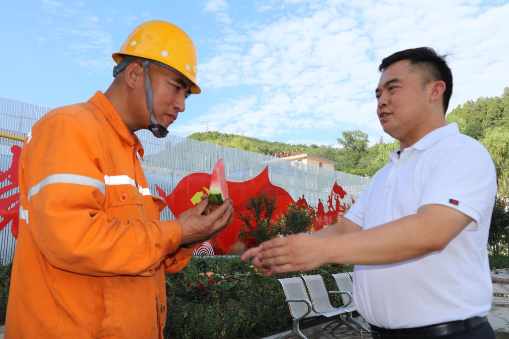 隨著夏季“三伏”天氣的到來,持續(xù)高溫的“桑拿”天氣,給堅守在一線的廣大職工帶來了身心上的巨大“烤”驗。為緩解因天氣炎熱帶來的身體不適。7月29日,該公司黨委書記衛(wèi)慶華,帶著黨政工領導班子的問候和叮囑,分別將西瓜、黃芪速飲茶、防暑降溫大禮包、王老吉涼茶、酸梅湯等飲品送到工作現(xiàn)場,并叮囑職工“要時刻注意安全,按章操作,做好防暑降溫工作。”職工們吃著西瓜、喝著酸爽可口的飲品,臉上露出了開心幸福的笑容。