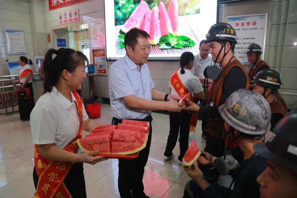 每到一處慰問點,家屬協(xié)管員把切好的西瓜送到職工手中,用親情的話語鼓舞廣大職工戰(zhàn)高溫、斗酷暑、促生產(chǎn)、保安全的斗志,叮囑他們按章作業(yè),安全生產(chǎn)。一塊塊西瓜、一句句貼心的話語讓辛苦工作的礦工兄弟們心里感受到了企業(yè)大家庭的溫暖。