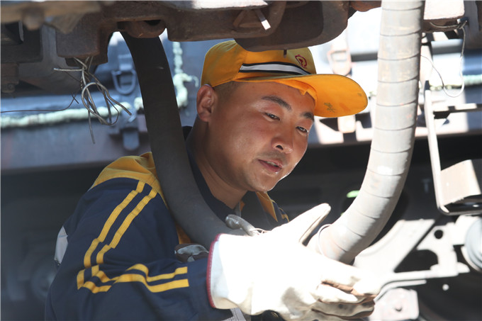 2.調(diào)車員褚偉杰正在連接風(fēng)管