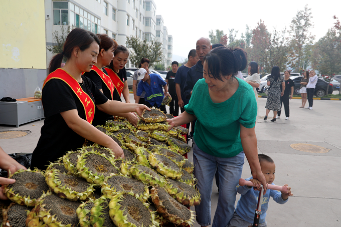“劉師傅,聽(tīng)說(shuō)礦上工會(huì)在家屬小區(qū)發(fā)向日葵呢,咱倆一起領(lǐng)去?!?/p>