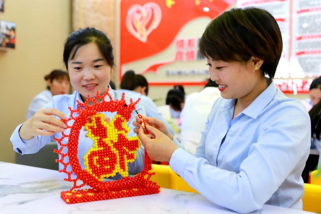 安文麗是一號煤礦的家屬協(xié)管員,自幼喜歡編織的她善于編織水晶“?!弊?。從9月月初,她便帶領(lǐng)13名家屬協(xié)管員們一起編織水晶“?!弊帧D愦┚€來我遞珠,在一雙雙的“巧手”的編織下,大小各異紅黃相間的水晶“?!弊直愠尸F(xiàn)出來。連日來一場秋雨飄飄灑灑讓礦區(qū)的涼意倍增,但在職工小家內(nèi)其樂融融,家屬協(xié)管員們串珠引線相互幫忙編織水晶“?!弊?,拍照發(fā)朋友圈展示自己的手工技藝,大家在編織水晶“福”下掛上祝福語,送給中秋節(jié)期間堅守崗位的班組,傳遞美好祝福、共享歡樂的時光。