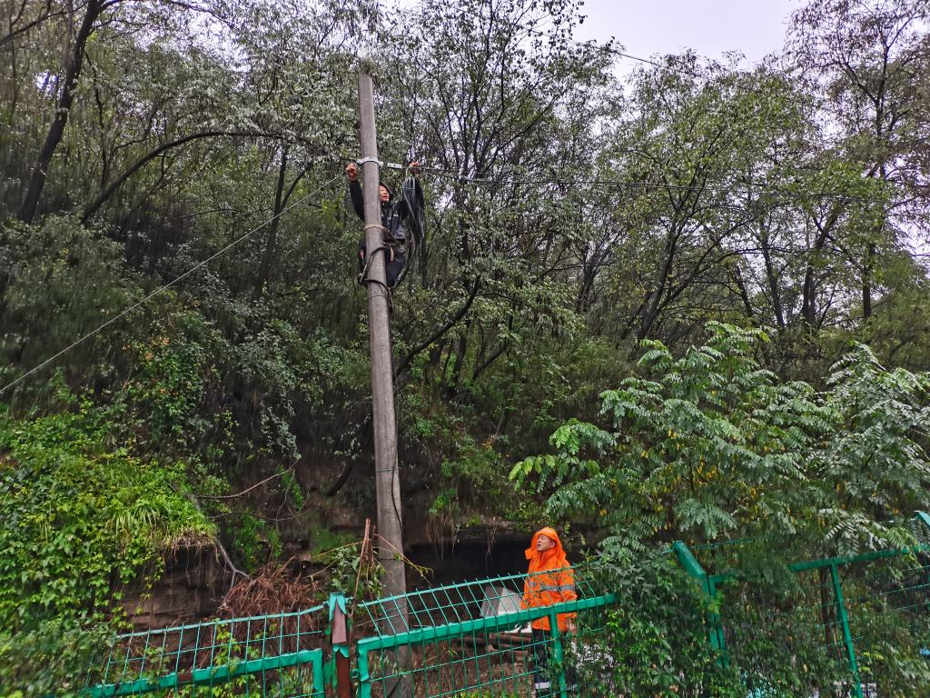 “小心點,注意腳下?!痹谛虑f科隧道口循著聲音望過去,通信工張謀正站在梯子上架拆除被沖斷的光纜。