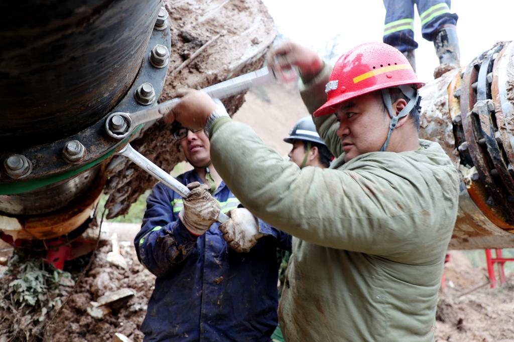 “不用換班,身體熱乎著呢,再有10節(jié)管路就到井口了”。黨員王黎峰帶頭用肩扛、手搬人工裝卸方式將89根長6米,重量近800斤運轉(zhuǎn)到位,完成管道的鋪設(shè)和連接,長時間的勞作使他的眼睛布滿了好多血絲。